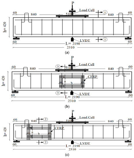The roles of fiber-reinforced polymers (FRP) in the strengthening of structural elements were investigated by different research works [1,6,7,8,9,10]. Beams with a T-section and an opening on the web were studied [1]. Local carbon-fiber-reinforced polymer strengthening was used to increase the shear capacity of the post-weakening beam to obtain a ductile failure process. Two different dimensions of opening were considered—the first was 300 mm in height and 700 mm in length; the second was 280 mm in height and 800 mm in length. Results showed that the strengthening of RC beams with CFRP increases the load capacity and decreases the deflection of the beams. The results also showed that the height of the opening is more sensitive than its length, and this finding was attributed to the significant effect of the height of the neutral axis that increases the tension area and consequently increases the area of cracks.