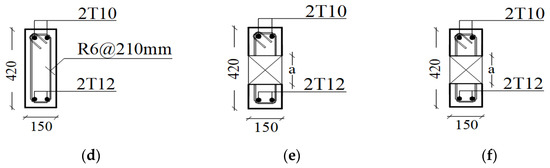 All the beams had the same dimensions, steel reinforcement, and material properties. The total length of the beams was 2310 mm with a 2190 mm span. All the beams had a rectangular cross-section of 420 mm in height and 150 mm in width. The main and the secondary steel reinforcement of the beams were two high tensile steel bars of 12 and 10 mm diameter, respectively. The shear reinforcement was 6 mm in the diameter stirrups of the mild steel bars with 210 mm fixed spaces, as shown in Figure 1.