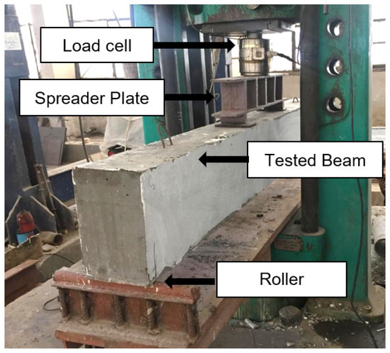 By using a testing machine of 1000 kN capacity, the beams were tested until failure. Two rollers were used as supports for the beams. The load applied by the machine was in two points with a 510 mm distance between the loading points, as shown in Figure 2. The deflection was measured at the beam mid-span by using PY-2-F-010-S01M LVDT (linear vertical displacement transducers) (Gefran, Lombardia, Italy). All of the tested beams were painted with white color to simplify the observation of the cracks, and the formation and propagation of the crack were observed by the naked eye. A displacement-controlled hydraulic actuator was used to load the beam. A spreader beam was used to split the load into two equal loads. The spreader beam is rested on the beam by using two circular rods and two loading plates. Due to the asymmetry of the beam, the deflections of the two supports of the spreader beam are not equal. The end at the opening side always has higher deformation than the other end which cause the beam to rotate slightly. To overcome this problem, the connection between the actuator and the midpoint of the spreader beam was permitted to rotate to follow the deformation of the beam and maintain the equal load condition.