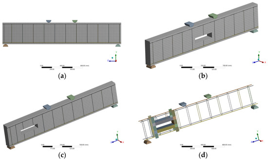 Finite Element Modeling. (a) control beam; (b) tension-zone opening; (c) shear-zone opening; (d) beam reinforcement.