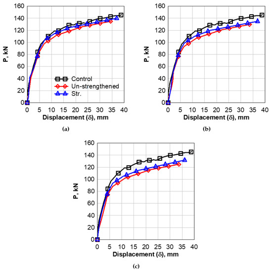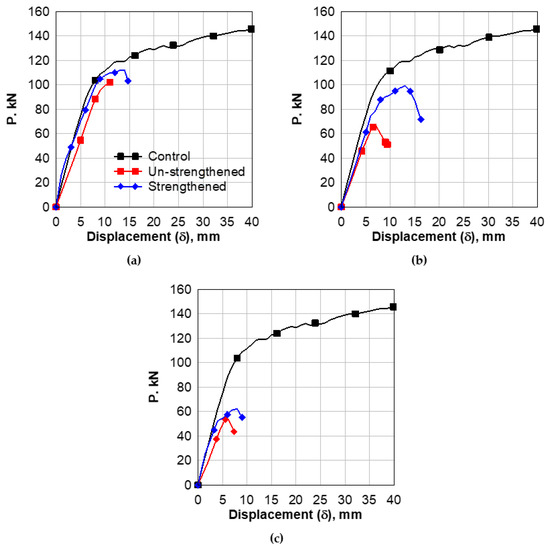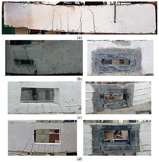 In this section, the experimental results will be analyzed and discussed. The load–deflection curves of the beams with and without strengthening for all opening sizes will be discussed and compared to the control beam in detail.