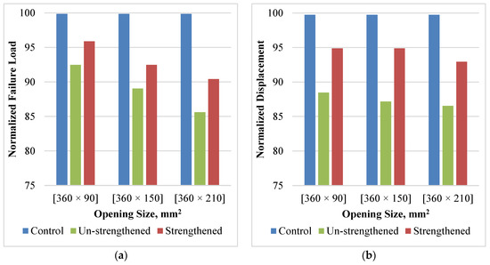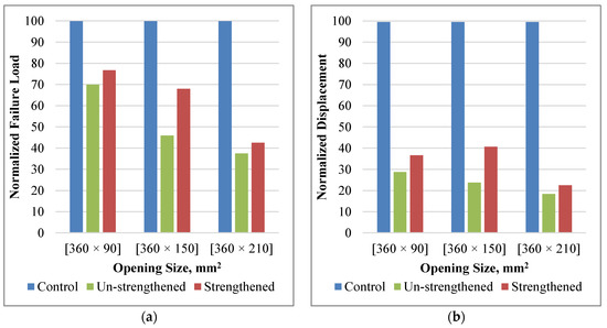 The failure displacement was normalized by finding the percent between the failure displacement of each case and the failure displacement of the control beam case, Figure 9b. Drilling the opening decreased the failure displacement significantly, which negatively affects the response of the beams under dynamic loads such as the blast and seismic loads. This enhanced the failure displacement by a maximum percentage of 17% for the beam with a 360 × 150 mm2 opening.