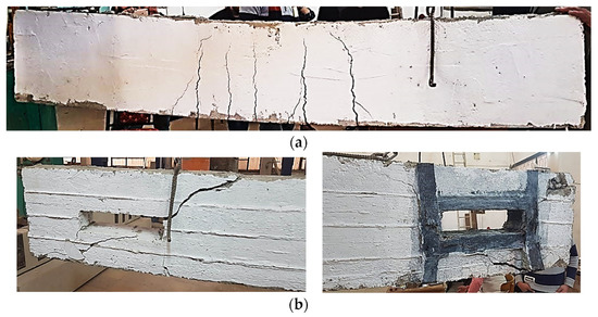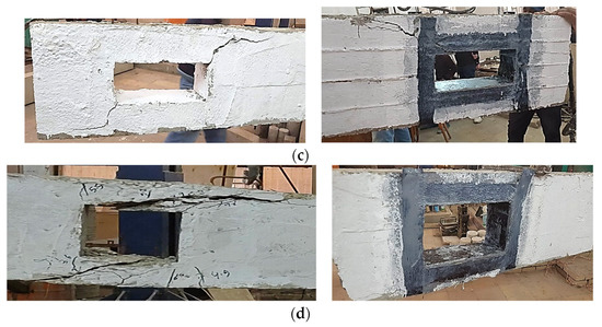For the strengthened sample with a 90 mm opening height, tension cracks appeared on the bottom fiber of the beam outside the reinforced zone and spread toward the top of the beam, Figure 5b. Crushing at the compression zone was observed at the top of the beam, and no delamination in the FRP layers was observed. The CFRP sheets prevented the tension failure of the bottom steel, which led to an increase in the load and initiated the crushing compression failure. For the beams with 150 and 210 mm opening heights, delamination failure was observed at the bottom side of the opening, combined with tension and compression cracks in the concrete, as shown in Figure 5c,d.
