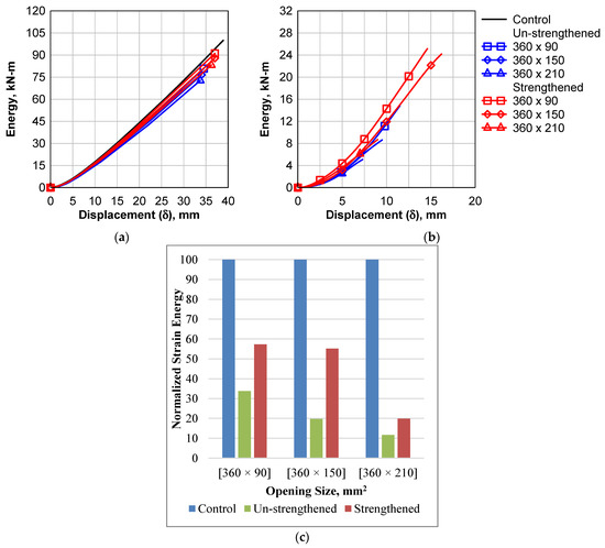 The ability of the structural system to absorb large amounts of strain energy before the final collapse is an indication of the efficiency of this system against the dynamic loads. The amount of strain energy (SE) absorbed was calculated for each beam was calculated, as shown in Figure 10. It can be found that the tension-zone openings do not show a significant reduction in the absorbed energy, see Figure 10a. The maximum absorbed energy of the control beam was 4.67 kN-m. The maximum reduction due to the tension opening was approximately 28% for the beam with an opening of 360 × 210 mm2. The strengthening of this beam enhanced the energy absorption behavior of the beam, and the reduction ratio became 17%. The effect of shear opening on the energy absorption was a sever effect, see Figure 10b,c. In Figure 10c, The strain energy was normalized by finding the percent between the strain energy of each case and the strain energy of the control beam case. The sample with 360 × 210 mm2 lost approximately 95% of the control beam energy absorption capacity. Although the strengthening of this beam enhanced the energy absorption behavior of the beam and the reduction ratio became 92%, it is not recommended to use the opening in the shear zone for concrete beam subjected to dynamic loads.