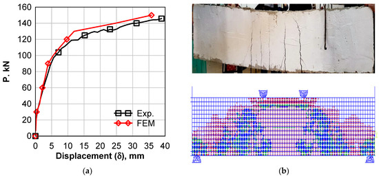 Figure 11a shows a comparison between the load–deflection curves of experimental tests and numerical simulation of the control beam. Both the numerical and experimental results exhibit linear behavior up to the first crack load, which was 45 kN and 40 kN for experimental and numerical, respectively, with a 33% difference. After that, the relationship exhibits non-linear behavior up to failure load. The maximum load was 145 kN for the experimental and 150 kN for the numerical results of the control beam, with a 4% difference. The mid-span deflection at maximum load is 40 mm and 35.8 for experimental and numerical, respectively, with a 10.5% difference. The numerical vs. experimental crack pattern is shown in Figure 11b; it can be found that the tension cracks collected mainly at the constant bending moment zone. A combination of shear and tension cracks was found at the constant shear area between the loading point and supports of the beam. It can be concluded that the numerical model was able to predict both the maximum load and failure pattern of the control beam.