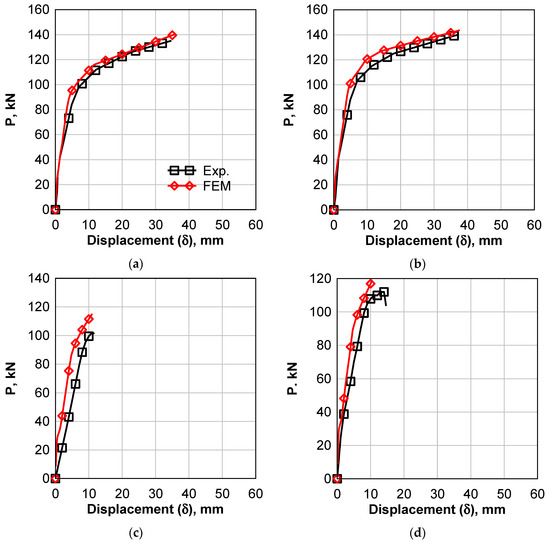 In this section, the finite element model results will be discussed. The comparisons between the load–displacement curves of the FE model and experimental tests will be described. The objective of this section is to develop a model that can simulate the beams with openings accurately, which can be used in the future to investigate different parameters.