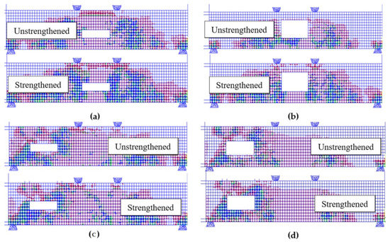 Figure 13 shows the numerical concrete cracking patterns for both 360 × 90 and 160 × 210 mm2 cases with and without strengthening. The cracks in the tension-zone opening samples shown in Figure 13a,b are mainly tension cracks at the constant moment zone and shear cracks at the constant shear-zone. Some compression-crushing crack appeared in the unstrengthened sample near the top fiber at the mid-span of the concrete beam for the sample with a 360 × 90 opening. Shear cracks also were observed at the corners of the openings, although they exist in the tension zone. A reduction in the density of cracks can be observed after the strengthening as the FRP sheet decreases the stress in the concrete. The cracks of the tension-zone opening samples are shown in Figure 13a,b. The cracks are mainly shear cracks at the top-right and bottom-left corners of the opening. At the mid-span, the shear cracks completely disappeared.