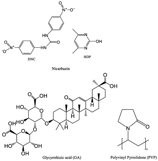 Nicarbazin (NIC) was purchased from Wuhan Changcheng Chemical Technology Development Co., Ltd. (Wuhan, China, purity: 98%). Glycyrrhizic acid (GA) was purchased from Shaanxi Pioneer Biotechnology Co., Ltd. (Xi’an, China, purity ≥ 98%). PVP K30 was acquired from Meryer Co., Ltd. (Shanghai, China, purity: 100%). All other chemicals used were analytical grade. Figure 1 shows the chemical structures of NIC, GA, and PVP.