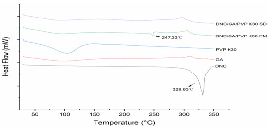 DSC curves of DNC, GA, PVP K30, DNC/GA/PVP K30 PM, and DNC/GA/PVP K30 SD.