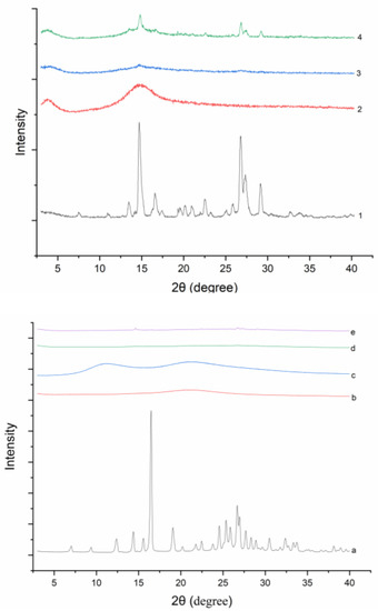 PXRD curves of (1, a) DNC, (2, b) GA, (3) DNC/GA SD, (4) DNC/GA PM, (c) PVP K30, (d) DNC/GA/PVP K30 SD, (e) DNC/GA/PVP K30 PM.