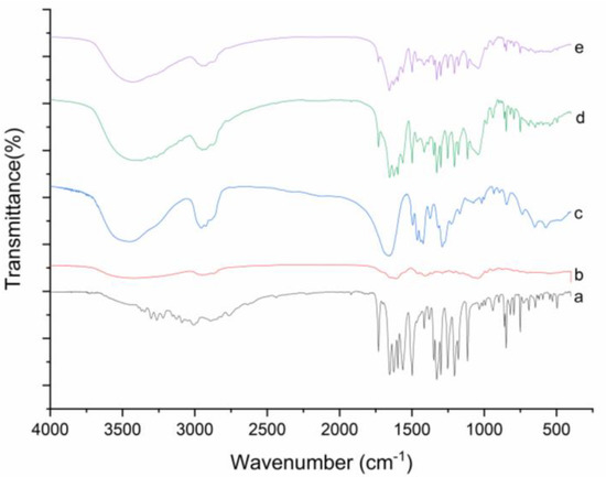 FT-IR spectra of (a) DNC, (b) GA, (c) PVP K30, (d) DNC/GA/PVP K30 SD, and (e) DNC/GA/PVP K30 SD.
