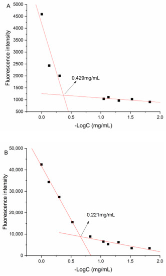 CMC value of (A) DNC/GA micelles; (B) DNC/GA/PVP K30 micelles.