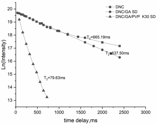 The method for the relaxation time of DNC and DNC solid dispersions by using an NMR relaxation study was discussed. The results of T2 relaxation times of the DNC binary and ternary system were 637.50 ms and 79.63 ms, Figure 9, shorter than DNC. Spin–spin relaxation times are related to molecular motions and binding state, the slow molecular mobility, and the closer the intermolecular interaction, the smaller the T2. It showed that the stabilization of DNC/GA/PVP K30 SD in D2O was clearly higher than that of the binary system, indicating that it accumulated in water to form more stable micelles [27].