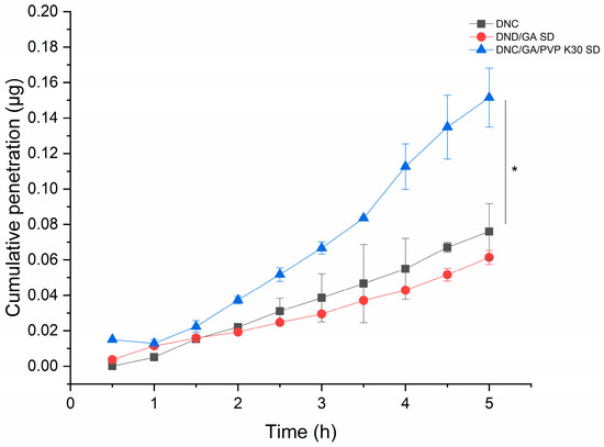 The cumulative penetration of DNC, DNC/GA SD, and DNC/GA/PVP K30 SD versus DNC, * p < 0.05.