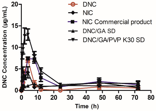 SD rats were fasted 12 h before operation and randomly divided into 5 groups (n = 6 per group) as follows: DNC, NIC, NIC commercial product (NIC CP), DNC/GA, and DNC/GA/PVP K30 group with oral administration 0.5% CMC-Na suspension of DNC (90 mg/kg) equivalent weight. Blood was collected from the eyelids at different time points: 0.5, 1, 2, 4, 8, 12, 24, 48, and 72 h, then centrifuged (4 °C, 10,000 rpm for 10 min) with supernatant collected, and the plasma samples were stored at −80 °C and applied for determination of the DNC content. In addition, 1 mL methanol was added to a 100 μL plasma sample, and the solution was vortexed and centrifuged at 10,000 rpm for 10 min. The supernatant was collected and the content of DNC in the plasma was determined by ultra-high performance liquid chromatography-tandem mass spectrometry (UPLC-MS, ACQUITY H-Class/Xevo TQS, Waters Corporation, Milford, MA, USA). The UPLC system was as follows: chromatography was performed on a C18 column (2.1 × 50 mm, 1.7 μm, Acquity UPLC), column temperature was 30 °C, with methanol–water (90:10, v/v) as the mobile phase, and the flow rate was 0.2 mL/min. MS analysis: electrospray ionization (ESI) with positive mode; capillary voltage, 3 kV; source temperature, 150 °C desolvation temperature, 350 °C; gas flow rate, 650 L/H.