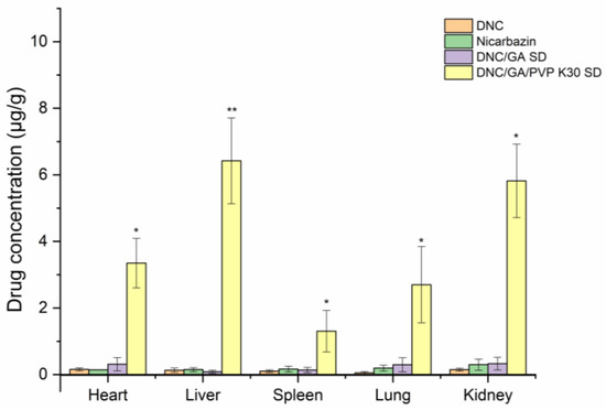 Thirty SD rats were fasted 12 h and randomly divided into 5 groups (n = 6 per group) as follows: DNC, NIC, and NIC commercial product, DNC/GA and DNC/GA/PVP K30 group with oral administration 0.5% CMC-Na suspension of DNC (90 mg/kg) equivalent weight for 7 days in a row. After the experiment was over, all animals were euthanized using CO2 following IACUC guidelines. The heart, liver, spleen, lungs, and kidneys were dissected and washed clean by normal saline (NS), wiped with filter paper. In addition, 0.2 g tissues were weighed and mixed with 1 mL NS and homogenized using a tissue grinder to obtain tissue homogenate. Furthermore, 0.5 mL tissue homogenate was added to 1 mL methanol and then homogenized and centrifuged at 4 °C at 10,000 rpm for 10 min; the supernatant was used to determine the content of DNC in the organs by UPLC-MS.