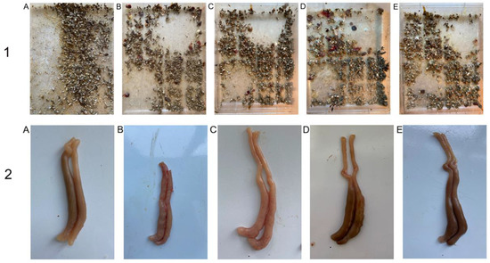 The images of hematochezia (1) and cecum (2) of chicken. (A) NC, (B) PC, (C) DNC, (D) NIC commercial product, (E) DNC/GA/PVP K30 SD.