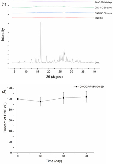 Figure 15 showed the results of DNC/GA/PVP K30 SD of PXRD, drug content, particle size, and zeta potential after three months of storage. As shown below, DNC/GA/PVP K30 SD has no significant crystal transformation and is still in a relatively amorphous state. Meanwhile, the DNC content of SDs, particle size, and zeta potential remained relatively steady compared with the original state. For DNC/GA/PVP K30 SD, which was packed with an aluminum foil bag, the size of particles increased after 30 days conjecturing that the package of that batch was not sealed completely, causing moisture absorption and agglomeration, and then decreased, indicating that DNC solid dispersion could keep the drug stable for a certain time. This evidence manifested that DNC SDs that were prepared by a mechanochemical force could reduce the generation of outgrowth, maintaining stability during the storage process.