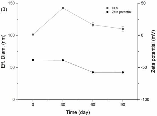 The same net weight of DNC/GA/PVP K30 SD was packed in aluminum foil bags, stored in a drug stability test chamber at 40 °C, 75% humidity, and the drug content, particle size, zeta potential, and X-ray diffraction were measured at 1, 2, and 3 months.