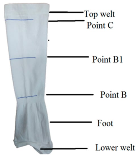 Compression stockings were manufactured using a professional circular compression knitting machine. The machine was a Merz CC4-2 instrument from Germany, with a 12 cm diameter, E 24 machine gauge, 360 needles and 4 feeders, including two furnishers. The first feeder has 10 fingers, while the second, third and fourth feeders have 8 fingers. For the development of compression stockings, inlay yarn was fed at the first and third feeders, while the plaiting yarn and main yarn were fed through the second and fourth feeders, respectively. At feeder no. 1, in finger 2 and feeder 8, nylon filaments yarn was used for foot formation. At feeder no. 3, double-covered yarn in finger no. 4 and nylon filament yarn in finger 6 were fed for top welt formation. The inlay yarn arrangement is the main decisive factor in the manufacturing of different knitted structures. Compression stockings were made in plain and mock rib structures. A total of six samples were developed, representing the plain, rib 2 × 2 and rib 1 × 3 structures. The samples differed according to their inlay yarn insertion pattern (laid in stitch) and structure. In the first 3 structures, with sample codes P, R1 and R2, the inlay yarn was inserted after one empty course, while in other three samples with codes IP1, IR1 and IR2, the inlay yarn was inserted in each course. At the start the welt was formed and after 2–3 steps or courses the welt was completed. The graduated pressure regions denoted as points C, B1 and B in Figure 2 were manufactured as per the program. In the final step, the foot portion was manufactured.