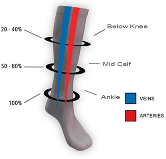 The successful usage of compression garments has been in practice for a long time in order to prevent medical issues such as scarring, edema and deep vein thrombosis (DVT) in hospitalized patients, either immediately after surgery or because of immobility due to a medical illness [,]. DVT can be prevented with the use of compression stockings instead of drugs. Drugs can cause bleeding, which is a primary concern in patients who have undergone surgery. Compression can be applied using bandages and elastic compression hosieries (ECHs). Compared with bandages, ECHs are generally more in demand due to their convenience and ease of care. Compression hosiery products can be developed using circular and flat knitting machines. These are functional products that combine knitting technologies to meet healthcare requirements. Graduated compression stockings (GCS) help prevent the formation of blood clots in the legs by applying varying amounts of pressure to different parts of the leg [,]. Compression stockings are known as an effective nonsurgical choice, exerting gradual pressure to prevent and to treat venous disease in legs []. In the field of healthcare, compression stockings play a significant role, being used as a first line of treatment to manage the increasing intensity of varicose veins or chronic venous diseases at the initial stages [,,]. Varicose veins are abnormal, whereby dilated blood vessels develop due to weaknesses in the vessel walls. This appears as swollen, twisted clusters or clots of blue or purple veins, which cause the blood to back up and pool inside the vein and make a new route []. Compression stockings exert an external pressure on lower limbs, reduce the vein diameter and increase the venous blood flow velocity, which helps the vein valves to function properly []. Researchers concluded that for compression stockings, ≥20 mmHg is an effective range of optimum pressure values that cause the fastest venous flow in various regions. There are different values for the ankle, calf, knee, lower thigh and upper thigh regions, which are 18 mmHg, 14 mmHg, 10 mmHg and 8 mmHg, respectively [].
