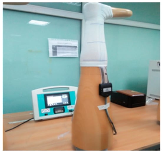 Compression testing can be performed in two ways in vivo (direct or wearer method) and in vitro (indirect or model method) using different instruments, such as a HOSY system, tensile testing device, HATRA and medical stocking tester (MST). In the present research, an in vitro method was adopted to evaluate the compression pressure values. A Sazlmann AG stocking measuring device available in different MST models (e.g., MST, MST II, MST III, MST IV and MST V models) (Salzmann AG, St Gallen, Switzerland, MST MK V), as shown in Figure 4, was used in the present research. The measurement principle of MST is based on the use of a pressure transducer. The compression testing was performed according to 387/1-2008, using quality and testing specifications for medical compression hosiery prescribed by RAL German Institute for Quality Assurance and Labeling []. A pneumatic probe or sensor was placed between a wooden leg and stocking samples. Compression pressure values were measured at the pressure points, e.g., the ankle (B), gaiter (B1) and calf (C). The samples were placed vertically along a wooden leg model with a circular cross-section. In compression garments, mmHg is commonly used as the unit of compression pressure to define the pressure dosage (1 mmHg = 133.322 Pascal). All pressure values were noted in mmHg. The pressure values were measured when each reading was stable. Three readings were taken at each point and the average was used for analysis. Three measurements were taken at each measurement point after an interval of three minutes.