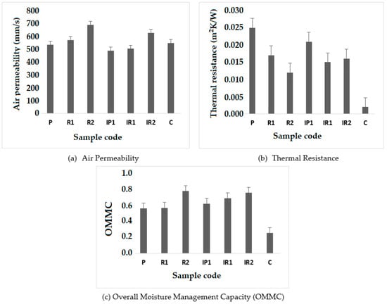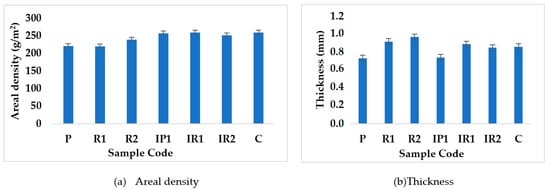 The fabric areal density and thickness values of all samples (P, R1, R2, IP1, IR1, IR2 and C) are compared in Figure 5.