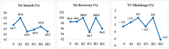 In total, 6 sets of experimental runs and corresponding experiments on the nine responses were performed, including compression by MST (mmHg), air permeability (AP in mm/sec), thermal resistance (TR in m2K/W), OMMC, stretch (%), recovery (%), shrinkage (%), thickness (mm) and areal density (g/m2), with the results given in Table 5.