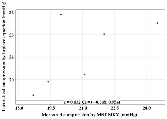 The deviation percent was calculated as the difference between the measured compression using the MST and pressure calculated using Laplace’s equation. The results in Table 6 show that the deviation values when applying Laplace’s equation for point B ranged from ±0.7% to ±57.6%. There was significant deviation when applying Laplace’s equation in all samples when compared with the practically measured compression values using the MST method. The deviation was higher in points where the inlay yarn insertion was increased. This is because more pressure is exerted with a higher inlay yarn insertion density. The theoretical pressure values calculated using the equation did not accurately predict the values found using the experimental method due to several limitations, as explained by other researchers [,,,]. The correlation coefficient of the interface pressure using both experimental and theoretical methods was found to be 0.632, as shown in Figure 7. Lower R values depict smaller correlations between the two methods.