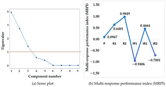 The normalized signal-to-noise ratios were taken for the analysis using Minitab 17. The first three components had eigenvalues greater than one, as shown in Table 10. The scree plot shown in Figure 9a was taken for further analysis. The normalized S/N ratios were used to perform the multivariate analysis using Minitab 17. The first and second principal components had eigenvalues greater than one. Thus, they were considered for further analysis. The principal component analysis matrix is given in Table 11. The results are presented in Figure 9b.