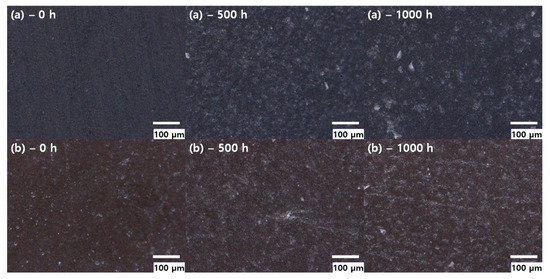 The deterioration of the fluoroelastomer was visually observed using an optical microscope. Figure 2 shows optical microscopy images of the fluoroelastomer with different aging times. As can be seen in Figure 2, the surface condition of the fluoroelastomer appeared smooth at first (as shown in Figure 2(a)–0 h and 2(b)–0 h) and then became rough with time. In general, all materials showed surface deterioration, including micro-cracks. The appearance of micro-cracks of fluoroelastomer appears to be caused by the migration of substances with a low molecular weight. These changes in surface properties may affect the crack initiation and ultimate failure [21,22].