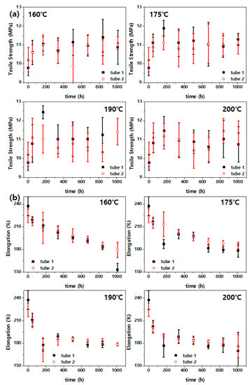 Figure 4 shows the change in the tension properties (i.e., strength and elongation) of fluoroelastomer samples aged under various high temperatures. Figure 4 shows that the mechanical properties of the fluoroelastomer gradually changed with the aging time. As can be seen in Figure 4a, the tensile strength shows very large deviations, and it is difficult to clearly distinguish a trend according to the aging time. Tube 1 showed average tensile strengths of 11.40 and 10.88 MPa after aging for 840 and 1008 h at 160 °C, respectively, and 11.02 and 10.74 MPa after aging for 840 h and 1008 h at 200 °C, respectively. Thus, it is difficult to specify the aging temperature as an acceleration variable because it results in insignificant differences in the tensile strength. This is considered attributable to the large variations of properties between samples resulting from the lack of continuity in the properties of the same samples because the tensile test destroys the sample. As a result, this seemingly makes it difficult to reliably infer the time required to reach the critical point of the tensile strength. As shown in Figure 4b, the elongation initially decreased sharply and then decreased slowly. This can be considered to show a tendency according to the aging time with aging temperature. However, as with the tensile strength, the variations of properties among the samples are large.