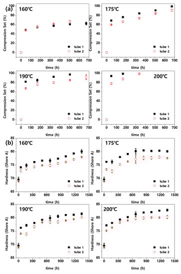 Figure 5 shows changes in the CS and hardness of the fluoroelastomer at various high temperatures. Figure 5a shows changes in the CS according to the aging time. CS indicates the elasticity (or resilience) of rubber materials. Most fluoroelastomer-hardening systems have cross-links and are stable against heat. Therefore, major network breakdown is rare in a short-term degradation test [1]. However, if the material is exposed to a high temperature for a long time, CS increases as the material loses resilience due to thermo-oxidative reaction. The CS changed rapidly and then slowly increased. The results for aging temperatures of 190 °C and 200 °C showed that the CS value reached 100% in the middle of the experiment. Because the resilience is no longer effective in this case, the subsequent experimental results were considered meaningless and were not plotted. Unlike the properties shown in Figure 4, those shown in Figure 5 did not exhibit significant deviations among the samples. This appears to be because the CS and hardness tests are nondestructive, and the values of the properties are continuous over the aging time. Figure 5a shows that the CS value of tube 1 at 160 °C is smaller than that of tube 2. However, at higher temperatures, the CS value of tube 1 is larger than that of tube 2. This implies that tube 1 has higher resilience at low temperature, whereas tube 2 has higher resilience at high temperature. Moreover, the resilience of tube 1 can be inferred to decrease sharply at temperatures higher than a certain value. This also affects the service life of a material. Figure 5b shows that, as in previous studies [3,16], the hardness rapidly increased in the early aging phase and then slowly increased. Furthermore, the hardness increase changed rapidly as the aging temperature increased. The time required for tube 1 to reach a hardness change rate of 10% was 577–805 h at 160 °C, 158–218 h at 175 °C, and 87–97 h at 200 °C.