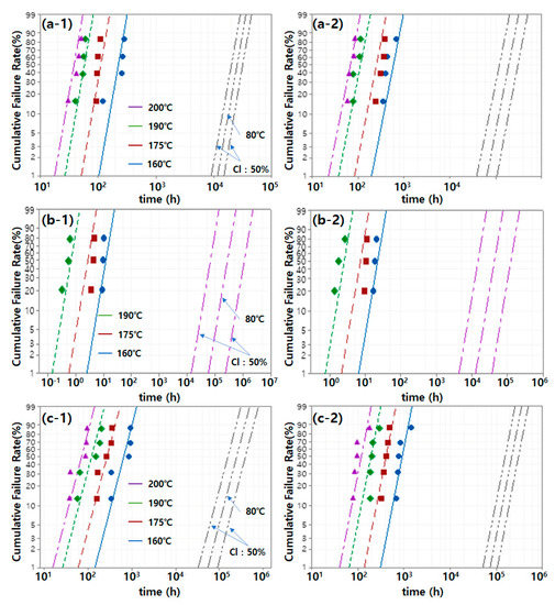 Figure 6 shows a straight line that has been fitted according to the acceleration parameter based on the failure time of the material derived from the results in Figure 4 and Figure 5. The three lines on the right side in each graph represent the estimated straight line assuming an operating temperature of 80 °C and 50% confidence interval (CI). Various mechanical properties were analyzed to obtain mechanical property data for accelerated life modeling. The “equivalent aging time,” which associates the result of accelerated thermal aging with the temperature profile of the actual use environment, can be calculated. Furthermore, the acceleration/prolongation factor, which associates the aging times at different aging temperatures, can be calculated [12]. As described in Figure 4a, the tensile strength was considered unsuitable as a parameter for service life prediction because it was difficult to infer its trend according to the aging temperature and aging time. As discussed with respect to Figure 4b, the estimated straight line in Figure 6a and the actual result (points in the graph) showed a difference owing to the large variation of the elongation. In Figure 6b, the CS at 200 °C changed within a short time (as shown in Figure 5a), resulting in insufficient data; thus, it was not used for service life prediction. As shown in Figure 6b, the threshold point arrival time at high temperature was very short. In this case, the experimental error could have a large effect.