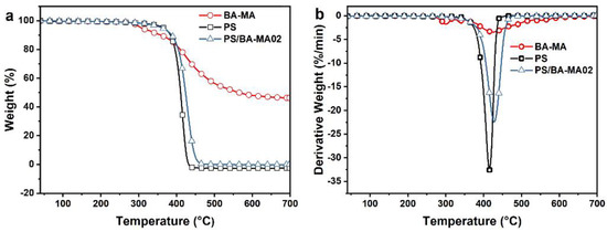 TG (a) and DTG (b) curves for PS, BA-MA, and PS/BA-MA.
