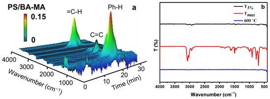 In contrast, the peak positions of PS/BA-MA02 mainly include 3070 cm−1 olefinic bond and the stretching vibration peak of CH on the benzene ring, the C=C stretching vibration peak at 1640 cm−1, and the out-of-plane bending vibration peak of benzene ring CH at 750 cm−1. The relative absorption peaks of BA-MA degradation products were not obvious. This shows that, in the process of thermal degradation of PS/BA-MA02, the typical thermal degradation behavior of PS is dominant. Compared with the TG-IR spectrum of pure PS, the relative intensities of each absorption peak of PS/BA-MA02 are reduced, indicating that the introduction of BA-MA can effectively inhibit the thermal degradation of PS.