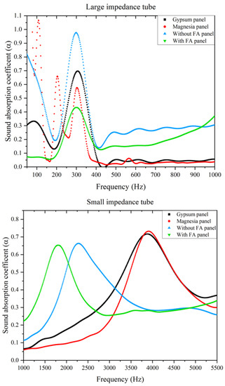 - The presence of natural fibers had a positive effect on the acoustic absorption properties, particularly in the range of 1000–3000 Hz. In this region, no absorption was detected for conventional stiff panels based on gypsum and magnesia. However, they exhibit absorption in the range of 3000–6000 Hz. The noise reduction coefficient also confirmed the importance of the presence of natural fibers in the panels.