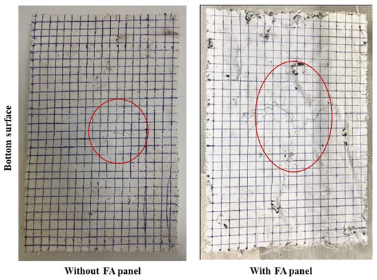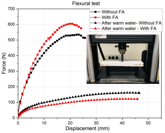 - As the resin content in the composite panels was fixed at 20 wt.%, water uptake of the panels were relatively higher than expected (panel with FA showed 30 wt.%, while the panel without FA showed 24.5 wt.%). Warm water testing has provided clear evidence of the disadvantages of these panels. A huge reduction in flexural strength was noted in the panels (irrespective of the presence or absence of FA) after the warm water testing. A reduction of 75% was observed for the panel with FA, while the panel without FA showed a drop of 69.5%.
