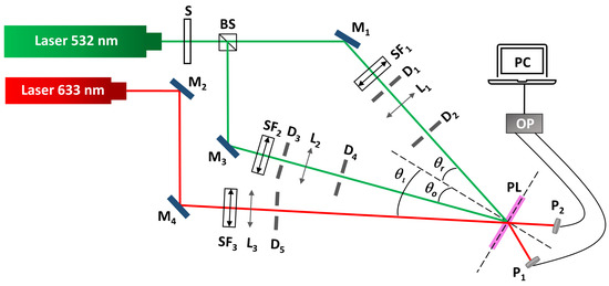 Holographic setup for transmission gratings. S: shutter; BS: beam splitter; SFi: spatial filters (microscope objective and pinhole); Mi: mirrors; Li: lens; Di: diaphragms; θo and θr: object and reference recording angle, θi: incident reconstruction angle; PL: hydrogel matrix; Pi: photodetectors; OP: optical power meter; PC: data recorder.