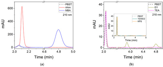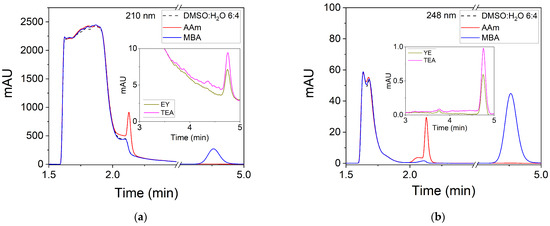Detection conditions must be changed when DMSO:H2O 6:4 is used as solvent for washing the hydrogels as DMSO exhibits an absorption band at 210 nm. The chromatograms of standard solutions with concentrations of 50 ppm of AAm and MBA are shown in Figure 4. When an absorption wavelength of 210 nm is used, the signal corresponding to AAm appears when the eluent front is ending (Figure 4a). This implies that the AAm peak overlaps with the signal from the DMSO:H2O 6:4 solvent and therefore its detection is difficult at low concentrations, i.e., when the concentrations of this compound in the washing solutions decrease. In order to solve this problem, an absorption wavelength of 248 nm was selected. Figure 4b illustrates that the AAm signal no longer overlaps with the solvent signal at 248 nm. AAm is detected at a retention time of 2.13 min for both absorption wavelengths. On the other hand, if the intensities of the AAm peaks are compared, there is a decrease from 925 mAU at 210 nm until 30 mAU at 248 nm. Despite this decrease in intensity, the 248 nm wavelength is used to detect AAm as there is no overlap with the solvent signal. The MBA signal is detected for both wavelengths at a retention time of 4.77 min without any interference from the solvent signal. The intensity of the signal is greater at 210 nm (272 mAU) compared to that obtained when a wavelength of 248 nm (45 mAU) is used for detection. The signals corresponding to EY and TEA are shown in the insets of Figure 4. These signals appear at the same retention time as MBA. Their intensities are around 4 mAU at 210 nm and less than 1 mAU at 248 nm. Considering that the intensity for the MBA signal is 282 mAU at 210 nm, the interference of EY and TEA does not represent a problem for the detection of MBA at this absorption wavelength.