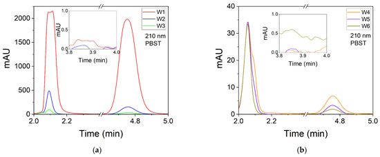 Once the retention times of the different compounds used in this work have been identified, the chromatograms of the six washing solutions (W1 to W6) are obtained. The results are shown in Figure 3a,b. AAm is detected at a retention time of 2.09 min in the washing samples from W1 to W4. If the signals for W5 and W6 are compared with the PBST blank signal, it is confirmed that AAm is not detected in the last two washing stages (Figure 3b). MBA is detected at a retention time of 4.75 min in all wash samples. The signal for the sixth washing stage W6 is weak and could be confused with the noise signal. Therefore, it could not be confirmed with certainty that MBA is present in the last washing step. The areas of the chromatograms corresponding to the AAm and MBA signals show a decreasing exponential trend as a function of the washing steps (Figure 3c).