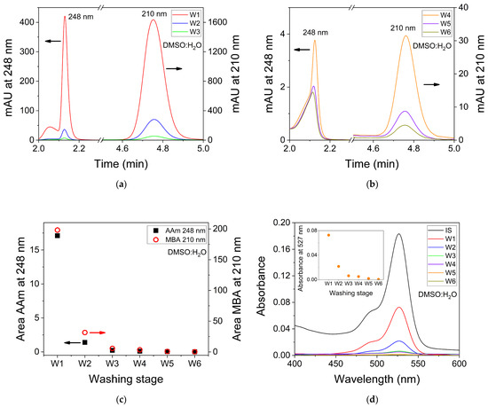 Chromatograms of the six washing samples with DMSO:H2O 6:4 are shown in Figure 5a,b. In these figures, the left axis represents the absorption at 248 nm used for the detection of AAm and the right axis shows the absorption at 210 nm used for the detection of MBA in the wash solutions. AAm and MBA are detected at retention times of 2.13 and 4.76 min, respectively. The decrease in the intensity of the AAm and MBA peaks as the number of washing stages increases is clearly observed. For the last washing step W6, both compounds show signs of their presence. However, these signals are very weak and close to the detection limit. The areas of the chromatograms for AAm and MBA show the same decreasing exponential behavior compared to that observed when the solvent used is PBST (Figure 5c). Most of the non-reacted AAm and MBA amount are removed in the first (W1) and second wash steps (W2). The area of the AAm signals cannot be compared with those obtained when PBST is used as solvent since the absorption wavelengths used for their detection are different. On the other hand, the areas of the MBA signals when both PBST and DMSO:H2O 6:4 are employed can be compared since a wavelength of 210 nm has been used in both measurements. The area values for MBA are 242 and 198 when PBST and DMSO:H2O 6:4, respectively, are used for washing. More MBA is removed in the first wash step W1 when PBST is used. The difference in the value of the areas for W1 is small and may be due to different factors, such as different thicknesses of the hydrogel matrices and slight differences in the concentrations of MBA in the incubator solutions.