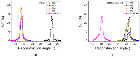 Diffraction efficiency as a function of the reconstruction angle for the two solvents used in the washing stage: (a) PBST; (b) DMSO:H2O 6:4. After exposure (W0, black square), after two washing steps (W2, blue circle), after four washing steps (W4, orange triangle), after six washing steps (W6, dark yellow triangle) and after one hour immersed in PBST (1 h PBST, magenta rhombus).