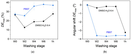 (a) Maximum diffraction efficiency (DEmax) and (b) angular shifts with respect to the reconstruction angle of holographic hydrogels after the different for the washing stages with the two solvents used: DMSO:H2O 6:4 (black square) and PBST (blue triangle). W0 indicates no washing.