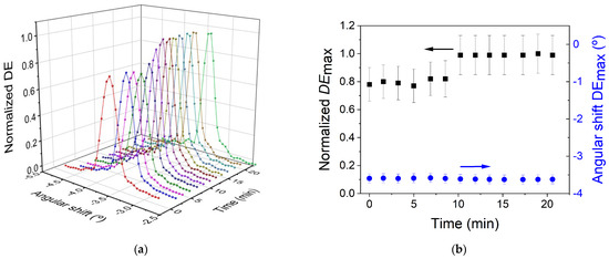(a) Temporal evolution of the normalized DE and angular shift for holograms stored in hydrogel matrices out of the solvent during the reconstruction step. (b) Maximum values of the Normalized DEmax (black square) and angular shift of the DEmax (blue circle) as a function of time.