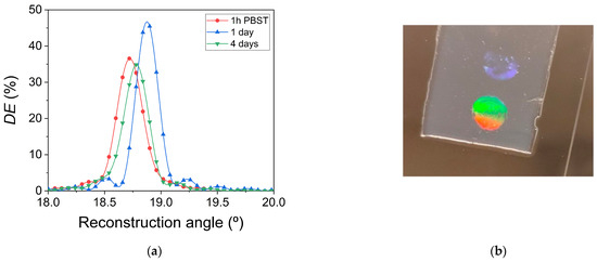 The temporal stability of the transmission gratings immersed in PBST solution for several days has also been investigated. For this, reconstruction measurements were carried out at three different times. The results are shown in Figure 9a. The angular scan obtained when the hydrogel is immersed in PBST for 1 h has already been shown in Section 3.2. This measurement is used in Figure 9a for a correct study of the temporal stability. After this measurement, the transmission gratings are immersed in a PBST solution for 1 day at 4 °C. This temperature was selected in order to preserve the hydrogel material in better conditions. After this time, a DEmax value of 46.7% and angular shift of 0.2° are measured. The transmission grating was again immersed in a PBST solution and stored at the same temperature for three days. After this time, a DEmax value of 35.0% and angular shift less than 0.1° are measured. These results indicate that the holograms are time-stable when immersed in PBST for several days. However, the different DEmax values show that caution should be exercised when comparing reconstruction measurements performed at different times. A possible explanation for the different values of the DEmax can contemplate the temperature change, to which the material is subjected when the reconstruction measurement is carried out. More studies should be carried out with this type of hologram, stored in hydrogel matrices, to clarify these differences.