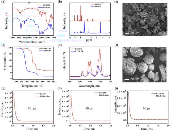 (a–c) FTIR spectra: (a) HNMR (b) and TGA (c) curves of REOC II and REOC III; (d) emission spectra of REOC II and REOC III under 340 nm UV light; (e,f) SEM images of (e) REOC II and (f) REOC III; (g–i) luminescent lifetime and fitting curves of (g) REOC I, (h) REOC II, and (i) REOC III.