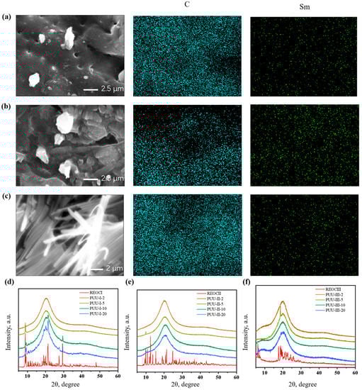 SEM and EDS images (C and Sm) of 20 phr REOC/PUU composites (a) REOC I, (b) REOC II, (c) REOC III; (d–f) XRD patterns of REOC/PUU composite materials (d) REOC I, (e) REOC II, (f) REOC III.