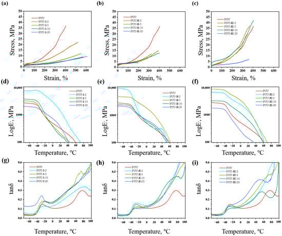 Stress–strain curves of PUU and REOC/PUU composites: (a) REOC I, (b) REOC II, (c) REOC III (2, 5, 10, 20 phr); (d–f) storage modulus of REOC/PUU composites with (d) REOC I, (e) REOC II, and (f) REOC III (2, 5, 10, 20 phr); (g–i) loss factor of PUU and REOC/PUU composites with (g) REOC I, (h) REOC II, and (i) REOC III (2, 5, 10, 20 phr).