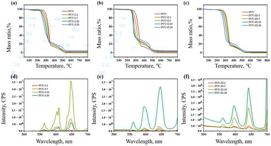 TGA (thermogravimetric analysis) curves of PUU and REOC/PUU composites with (a) REOC I, (b) REOC II, (c) REOC III (2, 5, 10, 20 phr); (d–f) fluorescence function spectra of REOC/PUU composites with (d) REOC I, (e) REOC II, and (f) REOC III (2, 5, 10, 20 phr) under 340 nm ultraviolet light.